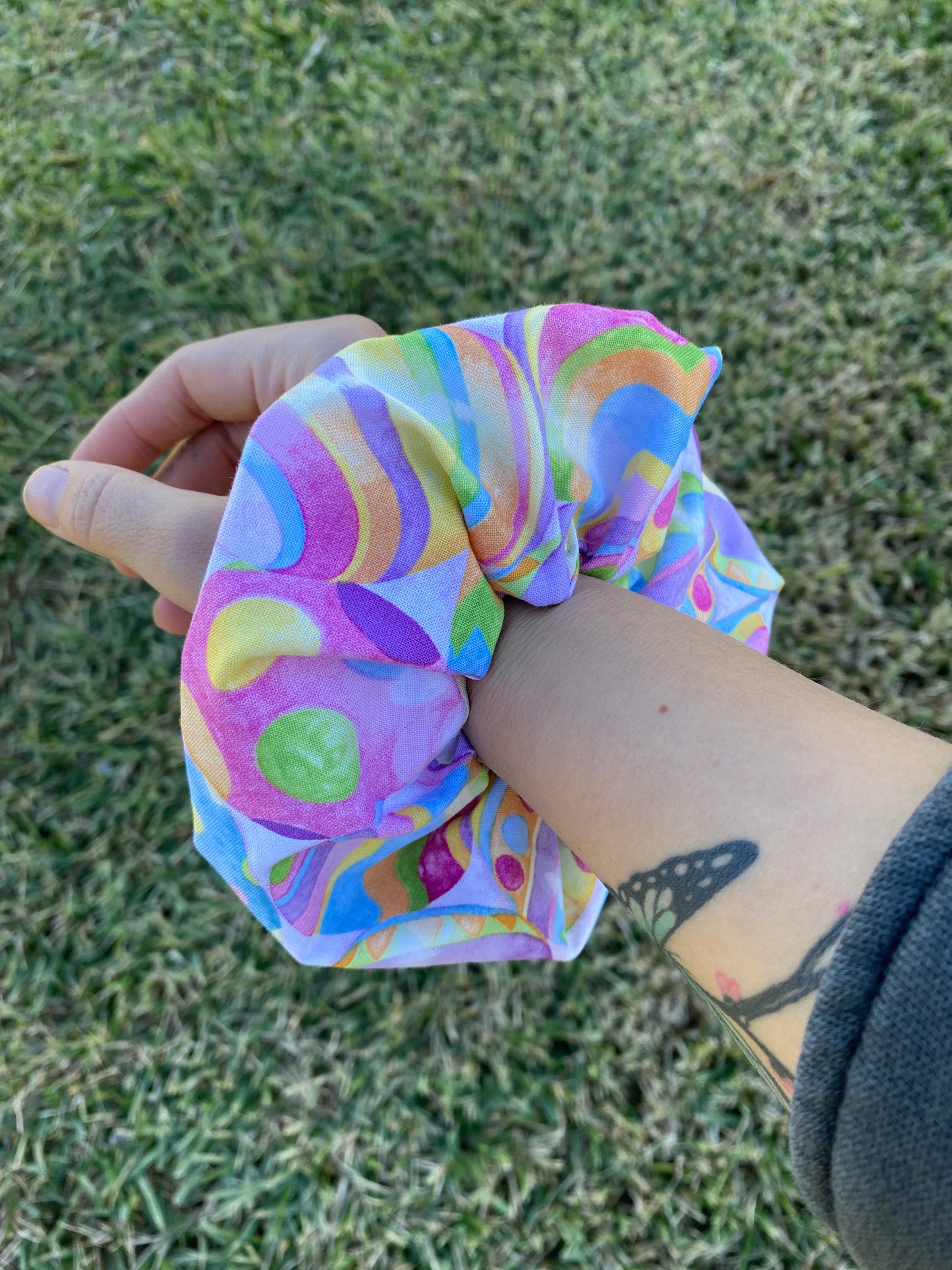 This super cute scrunchie is oversized and a sure way to stand out.  You can rock scrunchie hair ties with any outfit. We always add more fabric then recommended to make sure it gets noticed even when you are wearing it on your wrist. This 80s inspired look is unique, fun and the perfect look for your messy bun.